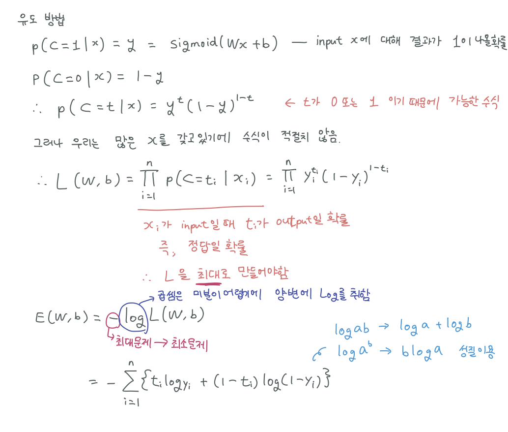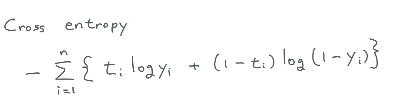 기존의 Linear regression 이후 signmoid 함수를 거치기 때문에 최종 결과물이 0 또는 1로 나와서 기존의 Loss function 은 사용할 수가 없습니다. 따라서 Logistic regression 을 위한 Loss function 을 새로 정의해야하고, 대표적인 함수로 Cross entropy 가 있습니다.
