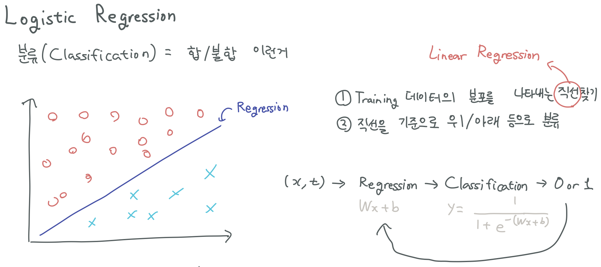 Linear regression 으로 구해진 z = Wx + b, z 를 시그모이드 함수에 넣으면 0과 1사이의 값이 나올 것이고, 0.5 보다 크면 1, 작거나 같으면 0으로 분류할 수 있습니다.