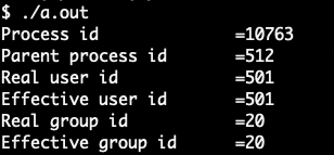 #include <stdio.h> #include <stdlib.h> #include <unistd.h> #include <sys/types.h> int main(int argc, char *argv[], char *envpp[]) { printf("Process id\t\t=%d\n", getpid()); printf("Parent process id\t=%d\n", getppid()); printf("Real user id\t\t=%d\n", getuid()); printf("Effective user id\t=%d\n", geteuid()); printf("Real group id\t\t=%d\n", getgid()); printf("Effective group id\t=%d\n", getegid()); exit(0); }