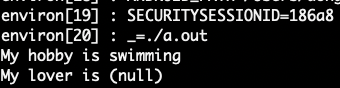 #include <stdio.h> #include <stdlib.h> #include <unistd.h> #include <string.h> extern char **environ; char glob_var[] = "HOBBY=swimming"; void ssu_addone() { char str[10]; // 지역변수를 환경변수에 추가 strcpy(str, "LOVER=js"); putenv(str); } int main(int argc, char *argv[], char *envpp[]) { for (int i = 0; environ[i] != NULL; i++) printf("environ[%d] : %s\n", i, environ[i]); // 전역변수를 환경변수에 추가 putenv(glob_var); // 지역변수를 환경변수에 추가 ssu_addone(); // 이후 각 환경변수를 출력해보면 전역변수로 등록한 HOBBY는 잘 뜸 printf("My hobby is %s\n", getenv("HOBBY")); // 하지만 지역변수로 등록한 LOVER는 뜨지 않음 printf("My lover is %s\n", getenv("LOVER")); // 전역변수더라도 문자열을 조작하게되면 환경변수 자체도 변함 // 즉 내부적으로 strcpy 하여 환경변수에 복사 저장하는 것이 아니라 // 단순 주소값만 저장한다는 것을 알 수 있음 strcpy(glob_var + 6, "fishing"); for (int i = 0; environ[i] != NULL; i++) printf("environ[%d] : %s\n", i, environ[i]); exit(0); }
