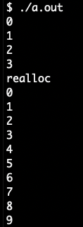 #include <stdio.h> #include <stdlib.h> #include <unistd.h> int main(int argc, char *argv[]) { int *arr; // sizeof(int) = 4 // 4 * 4 = 16 바이트 할당 요청 arr = (int *) calloc(4, sizeof(int)); for (int i = 0; i < 4; i++) { arr[i] = i; printf("%d\n", arr[i]); } printf("realloc\n"); arr = (int *) realloc(arr, sizeof(int) * 10); for (int i = 0; i < 10; i++) { arr[i] = i; printf("%d\n", arr[i]); } exit(0); }