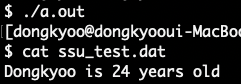 #include <stdio.h> #include <stdlib.h> #include <unistd.h> #include <memory.h> int main(int argc, char *argv[]) { char *fname = "ssu_test.dat"; char name[BUFSIZ]; FILE *fp; int age; fp = fopen(fname, "r"); fscanf(fp, "%s%d", name, &age); fclose(fp); fp = fopen(fname, "w"); fprintf(fp, "%s is %d years old\n", name, age); fclose(fp); exit(0); }