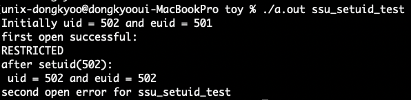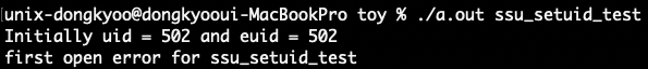 ssu_setuid_test 파일은 dongkyoo 계정의 소유이므로 unix-dongkyoo 는 파일을 열지 못함