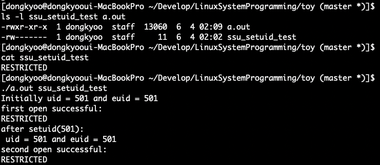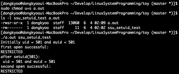 ssu_setuid_test 파일은 dongkyoo 계정의 소유이므로 정상적으로 동작하는 모습