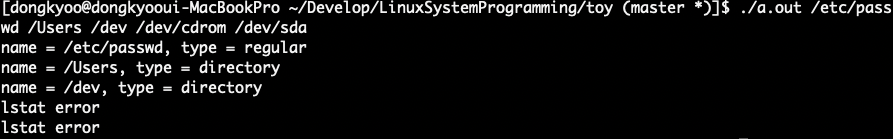 #include <stdio.h> #include <stdlib.h> #include <unistd.h> #include <sys/types.h> #include <sys/stat.h> int main(int argc, char *argv[]) { struct stat file_info; char *str; int i; for (int i = 1; i < argc; i++) { if (lstat(argv[i], &file_info) < 0) { fprintf(stderr, "lstat error\n"); continue; } printf("name = %s, type = ", argv[i]); if ((S_IFMT & file_info.st_mode) == S_IFREG) str = "regular"; else if ((S_IFMT & file_info.st_mode) == S_IFDIR) str = "directory"; else if ((S_IFMT & file_info.st_mode) == S_IFCHR) str = "character special"; else if ((S_IFMT & file_info.st_mode) == S_IFBLK) str = "block special"; else if ((S_IFMT & file_info.st_mode) == S_IFIFO) str = "FIFO"; else if ((S_IFMT & file_info.st_mode) == S_IFLNK) str = "symbolic link"; else if ((S_IFMT & file_info.st_mode) == S_IFSOCK) str = "socket"; else str = "unknown"; printf("%s\n", str); } exit(0); }