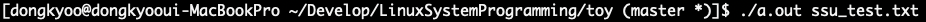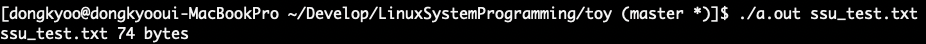 #include <stdio.h> #include <stdlib.h> #include <unistd.h> #include <sys/types.h> #include <sys/stat.h> int main(int argc, char *argv[]) { struct stat statbuf; if (stat(argv[1], &statbuf) < 0) { fprintf(stderr, "stat error\n"); exit(1); } // statbuf.st_size = 파일의 크기 printf("%s %ld bytes\n", argv[1], statbuf.st_size); exit(0); }